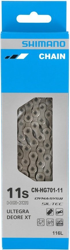 Deze nieuwe Ultegra HG701 11-Speed ketting is geoptimaliseerd voor de Shimano 2 x 11-speed groepen: Dura Ace, Ultegra en 105. De nieuwe 11-speed ketting uit de Ultegra lijn van Shimano is weer verder geoptimaliseerd ten opzichte van zijn voorganger. De ketting heeft een langere levensduur en is natuurlijk ook te gebruiken met andere 11-speed Shimano groepen. Productspecificaties: Materiaal: staal Soepel en betrouwbaar schakelen Efficienter en stiller, minder onderhoud SIL-TEC oppervlaktebehandeling Geschikt voor Race, MTB en E-Bike met 11-speed Verstevigde ketting Gewicht: +/- 257 gram (dit is het gewicht van de variant met 116 schakels) Aantal schakels: 138 Inclusief breekpen